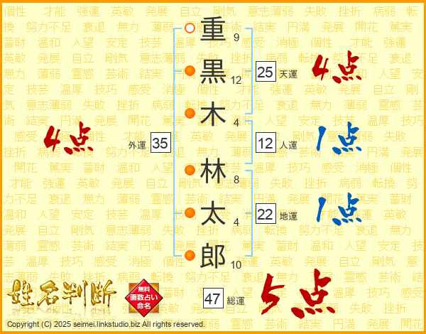 重(9画)黒(12画)木(4画) 林(8画)太(4画)郎(10画)