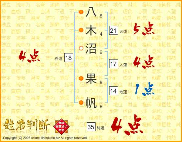八(8画)木(4画)沼(9画) 果(8画)帆(6画)
