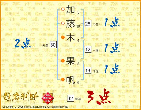 加(5画)藤(19画)木(4画) 果(8画)帆(6画)