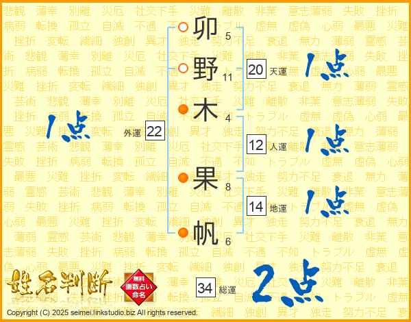 卯(5画)野(11画)木(4画) 果(8画)帆(6画)