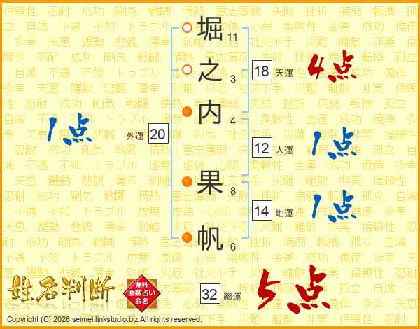 堀(11画)之(3画)内(4画) 果(8画)帆(6画)