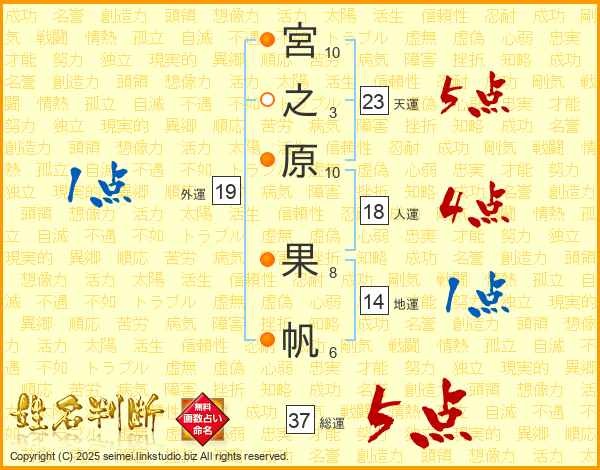 宮(10画)之(3画)原(10画) 果(8画)帆(6画)