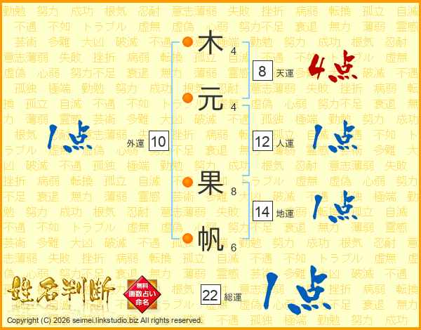 木(4画)元(4画) 果(8画)帆(6画)