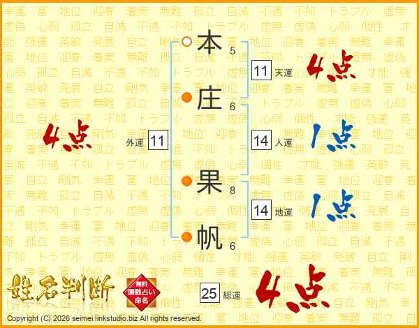 生活面を象徴する運勢です。外部から受ける影響力を表し、結婚運、家庭運や職場、環境への順応性を表します。総運から人運を引いた画数。姓や名が1文字の場合を除く。
