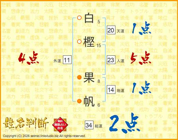 生活面を象徴する運勢です。外部から受ける影響力を表し、結婚運、家庭運や職場、環境への順応性を表します。総運から人運を引いた画数。姓や名が1文字の場合を除く。