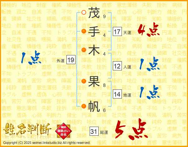 茂(9画)手(4画)木(4画) 果(8画)帆(6画)