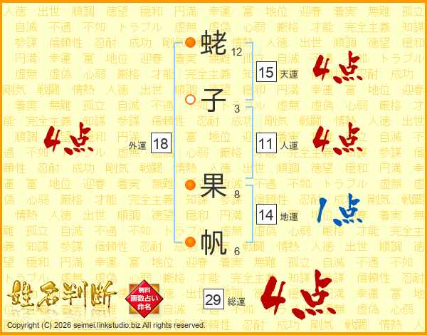 蛯(12画)子(3画) 果(8画)帆(6画)