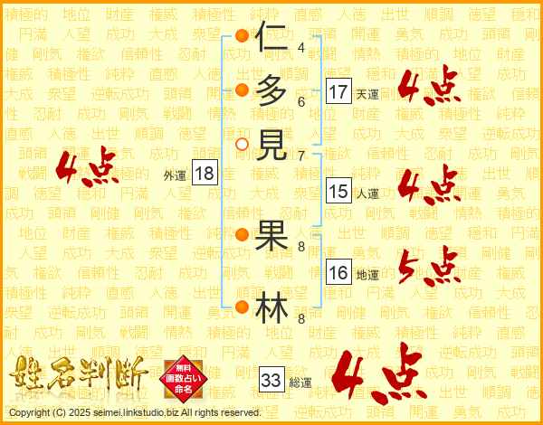 仁(4画)多(6画)見(7画) 果(8画)林(8画)