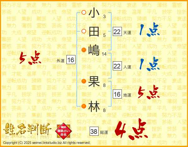 小(3画)田(5画)嶋(14画) 果(8画)林(8画)