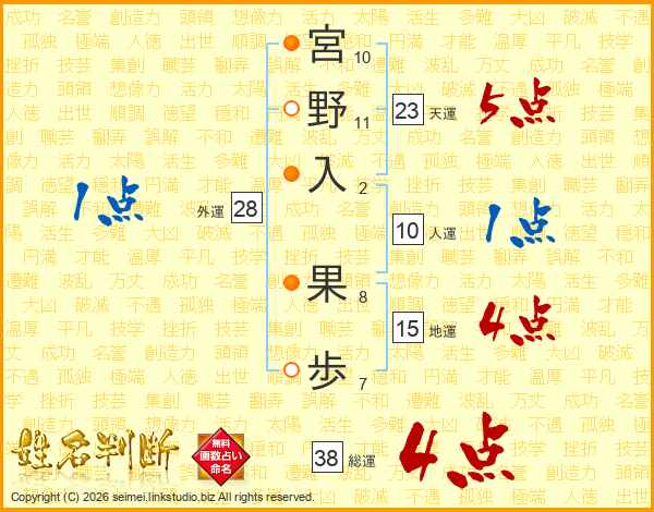 宮(10画)野(11画)入(2画) 果(8画)歩(7画)