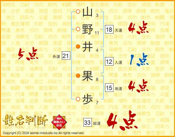 山(3画)野(11画)井(4画) 果(8画)歩(7画)