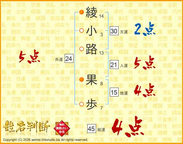 綾(14画)小(3画)路(13画) 果(8画)歩(7画)