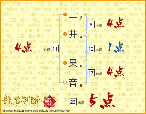 生活面を象徴する運勢です。外部から受ける影響力を表し、結婚運、家庭運や職場、環境への順応性を表します。総運から人運を引いた画数。姓や名が1文字の場合を除く。