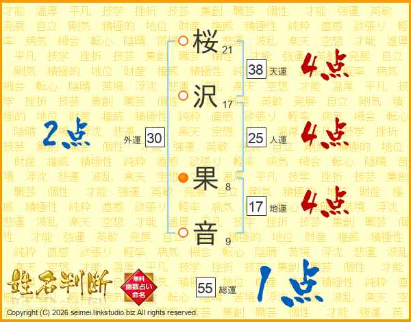 生活面を象徴する運勢です。外部から受ける影響力を表し、結婚運、家庭運や職場、環境への順応性を表します。総運から人運を引いた画数。姓や名が1文字の場合を除く。