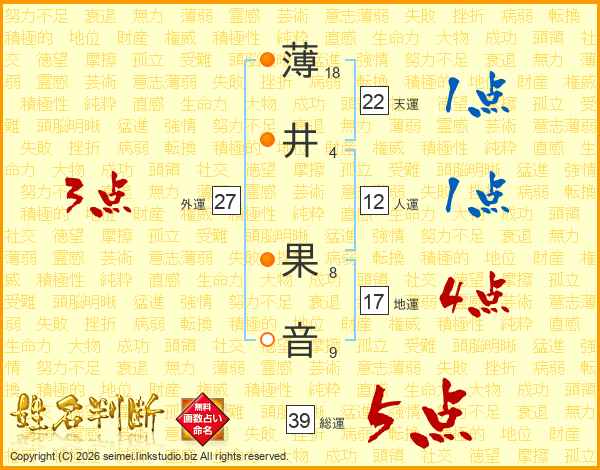 生活面を象徴する運勢です。外部から受ける影響力を表し、結婚運、家庭運や職場、環境への順応性を表します。総運から人運を引いた画数。姓や名が1文字の場合を除く。