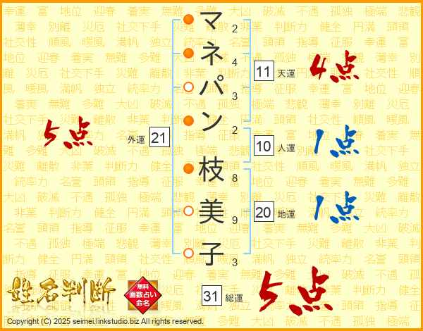 マ(2画)ネ(4画)パ(3画)ン(2画) 枝(8画)美(9画)子(3画)