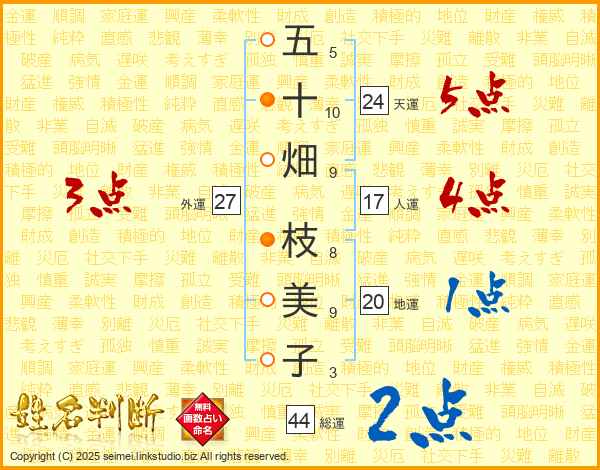 五(5画)十(10画)畑(9画) 枝(8画)美(9画)子(3画)