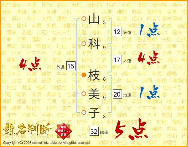 山(3画)科(9画) 枝(8画)美(9画)子(3画)