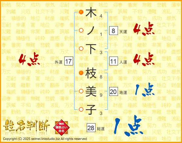 木(4画)ノ(1画)下(3画) 枝(8画)美(9画)子(3画)