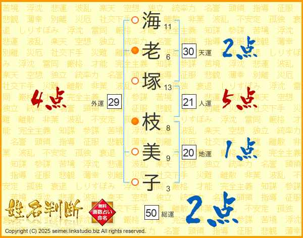 海(11画)老(6画)塚(13画) 枝(8画)美(9画)子(3画)