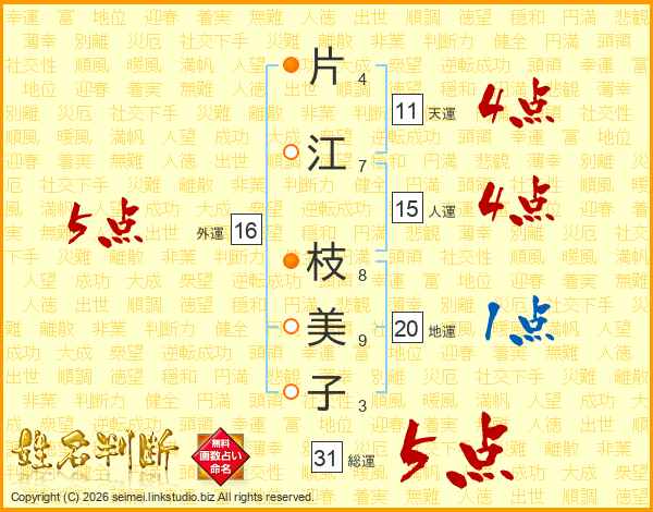 片(4画)江(7画) 枝(8画)美(9画)子(3画)