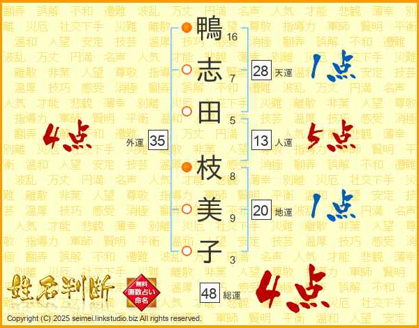 鴨(16画)志(7画)田(5画) 枝(8画)美(9画)子(3画)