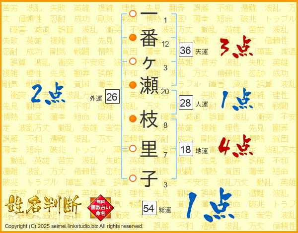 一番ヶ瀬枝里子さんの総運は54画の1点!