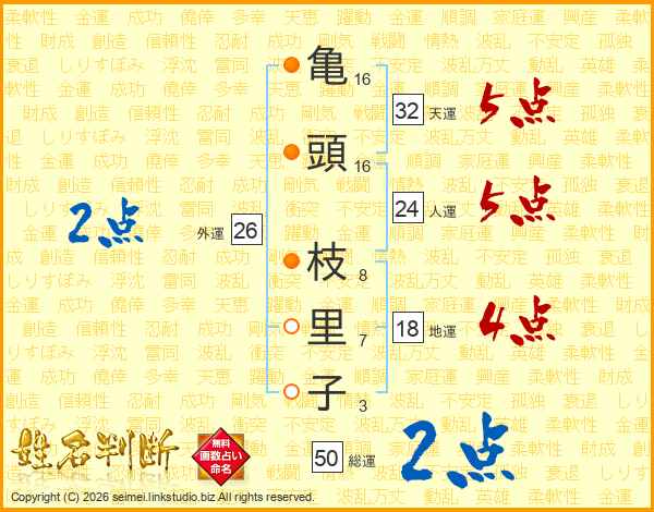 亀頭枝里子さんの外運は26画の2点!