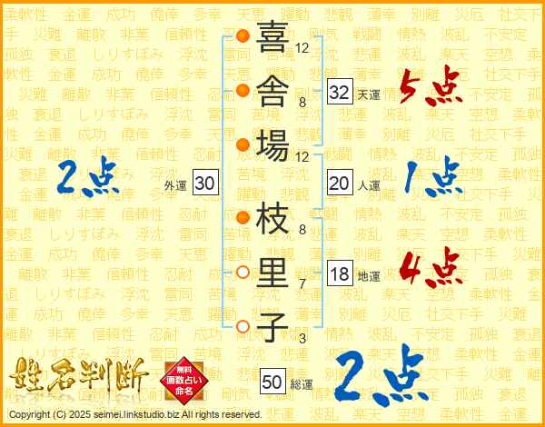 喜(12画)舎(8画)場(12画) 枝(8画)里(7画)子(3画)