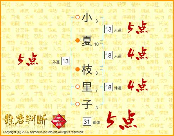 小夏枝里子さんの総運は31画の5点!