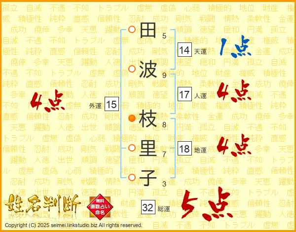 田(5画)波(9画) 枝(8画)里(7画)子(3画)