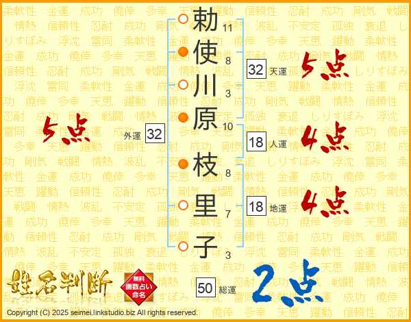 勅(11画)使(8画)川(3画)原(10画) 枝(8画)里(7画)子(3画)