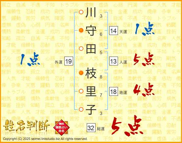 川(3画)守(6画)田(5画) 枝(8画)里(7画)子(3画)