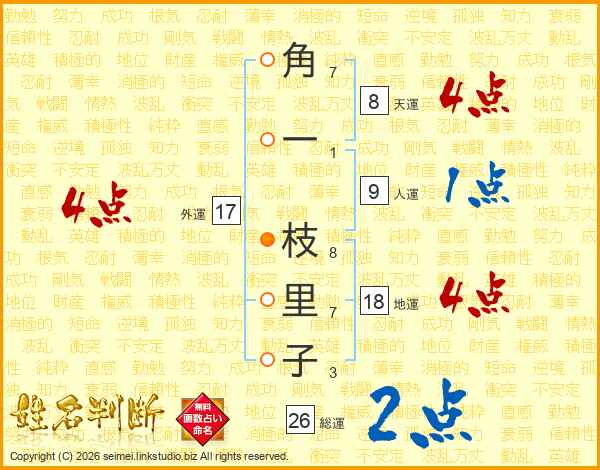 生活面を象徴する運勢です。外部から受ける影響力を表し、結婚運、家庭運や職場、環境への順応性を表します。総運から人運を引いた画数。姓や名が1文字の場合を除く。