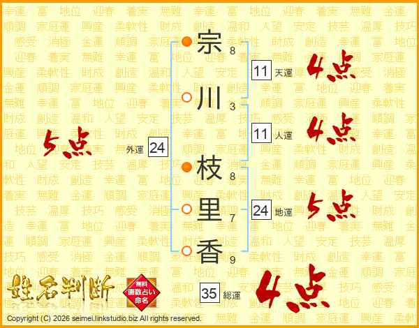 宗(8画)川(3画) 枝(8画)里(7画)香(9画)