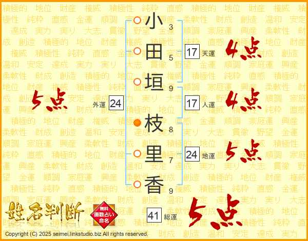 小(3画)田(5画)垣(9画) 枝(8画)里(7画)香(9画)