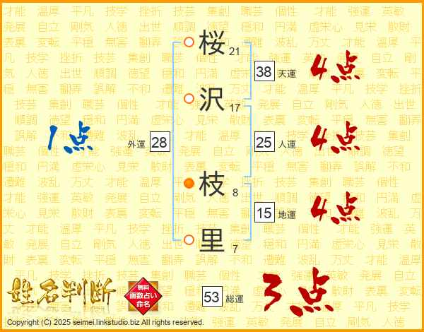 桜(21画)沢(17画) 枝(8画)里(7画)