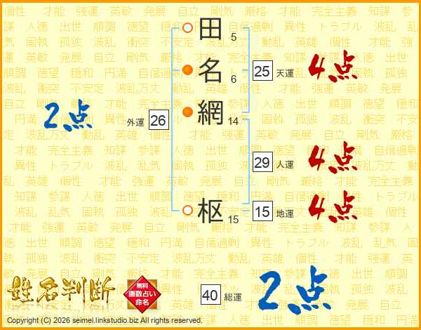 家系が持つ宿命的な運勢を表します。祖先から受け継いだ苗字ですので自分の力が及びません。家柄を象徴します。苗字の合計画数。