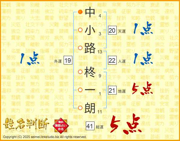 中(4画)小(3画)路(13画) 柊(9画)一(1画)朗(11画)