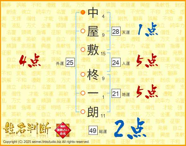 中屋敷柊一朗さんの地運は21画の5点!