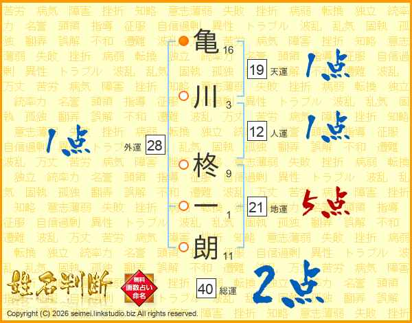 亀(16画)川(3画) 柊(9画)一(1画)朗(11画)