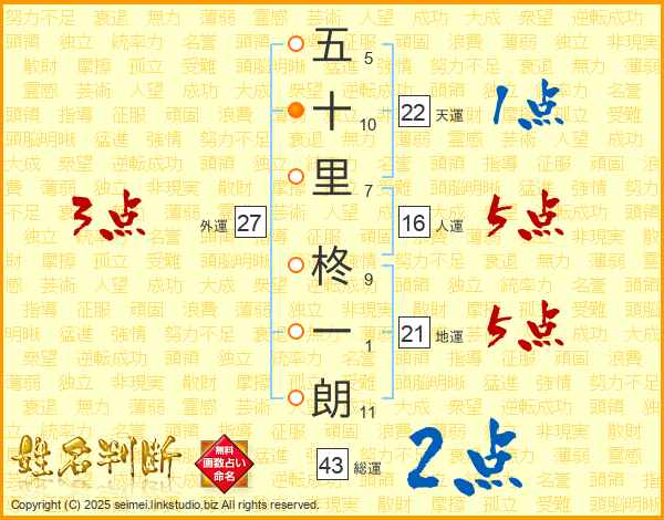 あなたの人生を表す1番重要な運勢です。生涯を通じて影響する総合運となり、主に50歳以降の晩年期に影響を及ぼします。苗字と名前の合計画数。