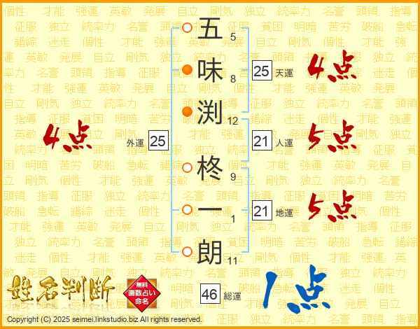 五(5画)味(8画)渕(12画) 柊(9画)一(1画)朗(11画)