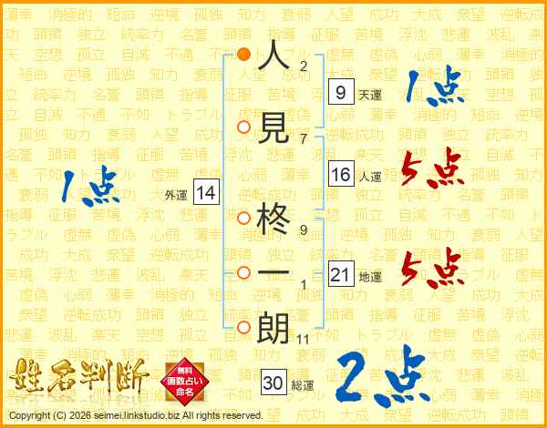 人(2画)見(7画) 柊(9画)一(1画)朗(11画)
