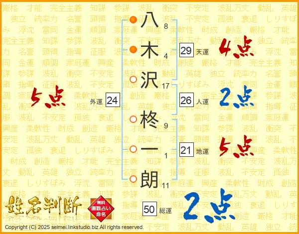 八(8画)木(4画)沢(17画) 柊(9画)一(1画)朗(11画)