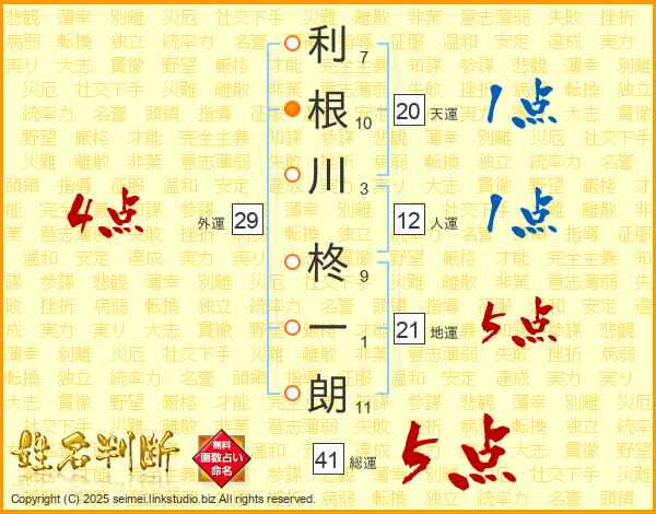 利(7画)根(10画)川(3画) 柊(9画)一(1画)朗(11画)