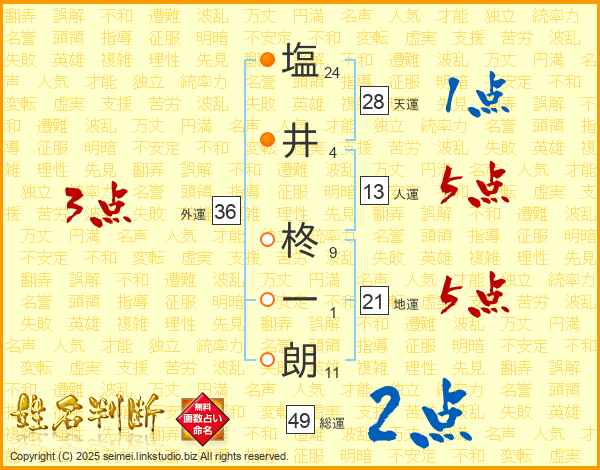塩(24画)井(4画) 柊(9画)一(1画)朗(11画)