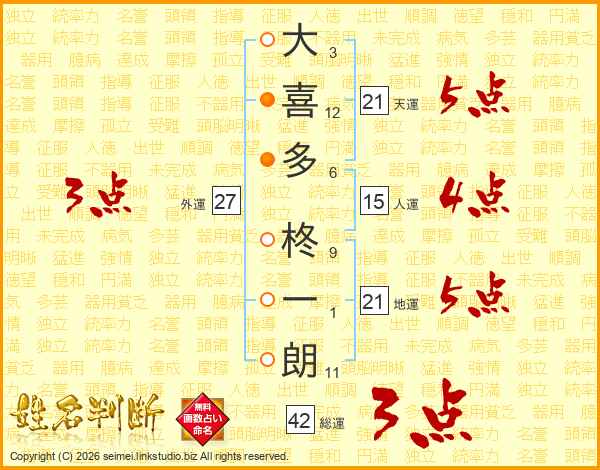 大(3画)喜(12画)多(6画) 柊(9画)一(1画)朗(11画)