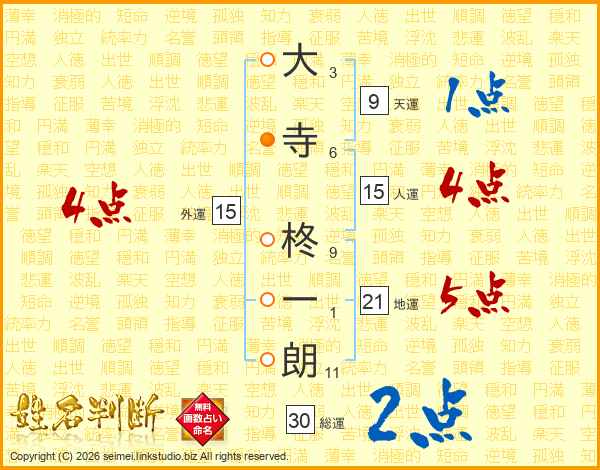 大(3画)寺(6画) 柊(9画)一(1画)朗(11画)