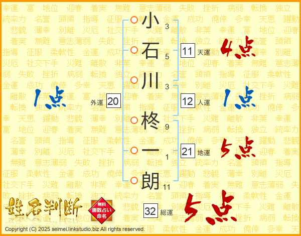 小(3画)石(5画)川(3画) 柊(9画)一(1画)朗(11画)